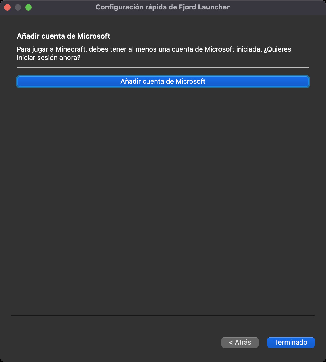 - Si tienes Minecraft comprado puedes iniciar sesión con Microsoft y saltarte este apartado; si no, pulsa Terminado