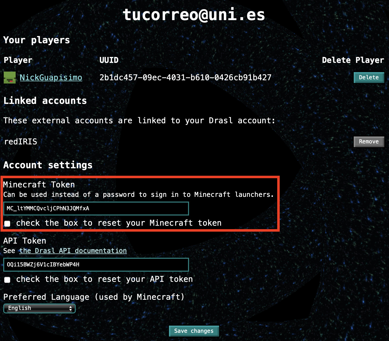 - En el apartado "Minecraft Token", copia el código que empieza con "MC_"
